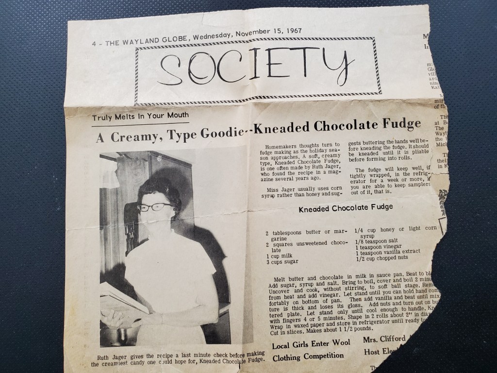 Cousin Dawn Jager asked about Aunt Ruth’s fudge recipe. Perhaps this is it. I found this in her recipe book (more a clipping file of recipes). It looks like the Jagers dominated the Wayland Globe in November, 1967. (I wonder if they were worried about being overexposed.) I’m not familiar with fudge that is kneaded. And here is another fudge recipe from her book: